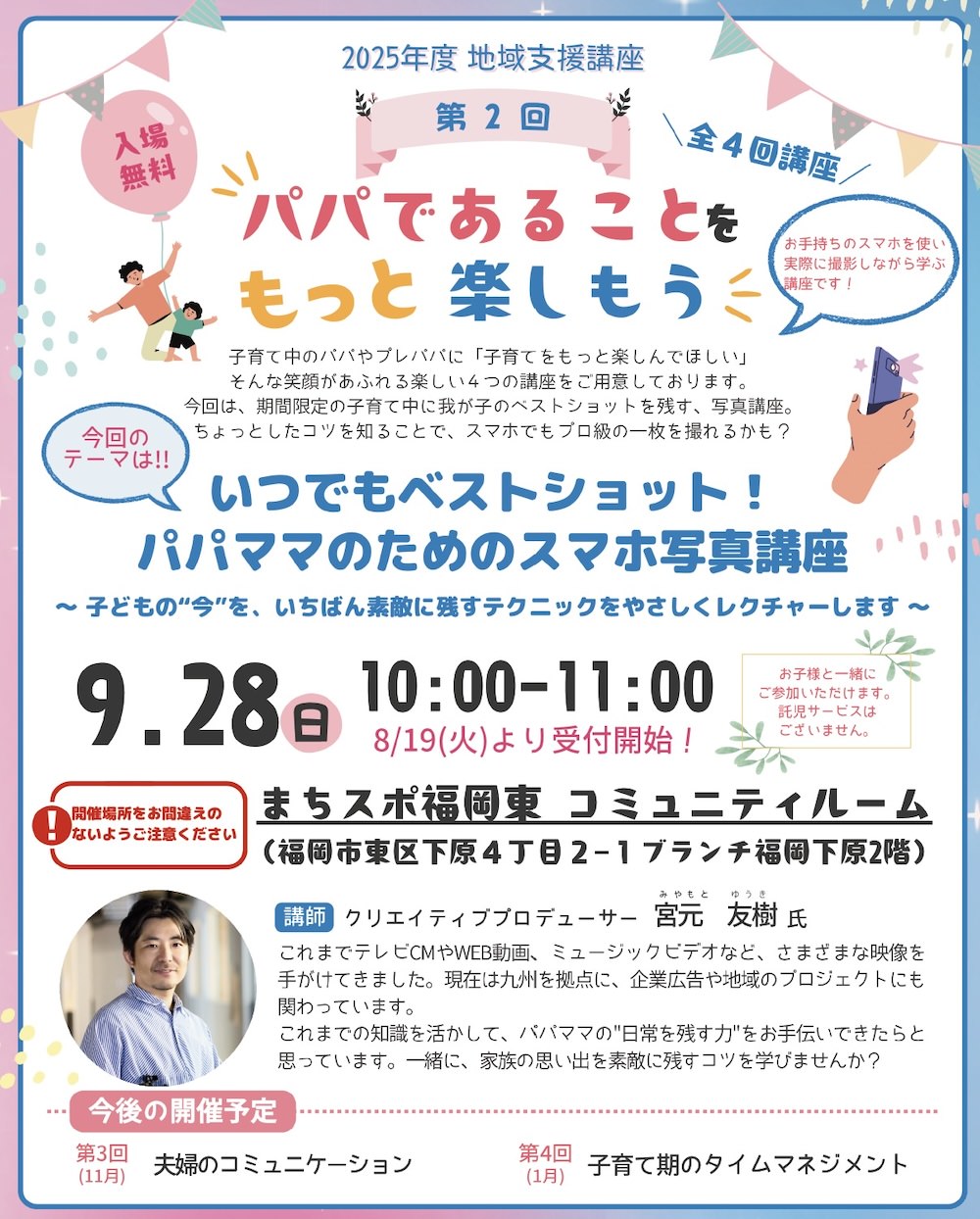 子育て中のパパやプレパパに「子育てをもっと楽しんでほしい」そんな笑顔あふれる4つの講座をご用意しております。今回は、期間限定の子育て中に我が子のベストショットを残す、写真講座。ちょっとしたコツを知ることで、スマホでもプロ級の一枚を撮れるかも?【入場・参加無料】