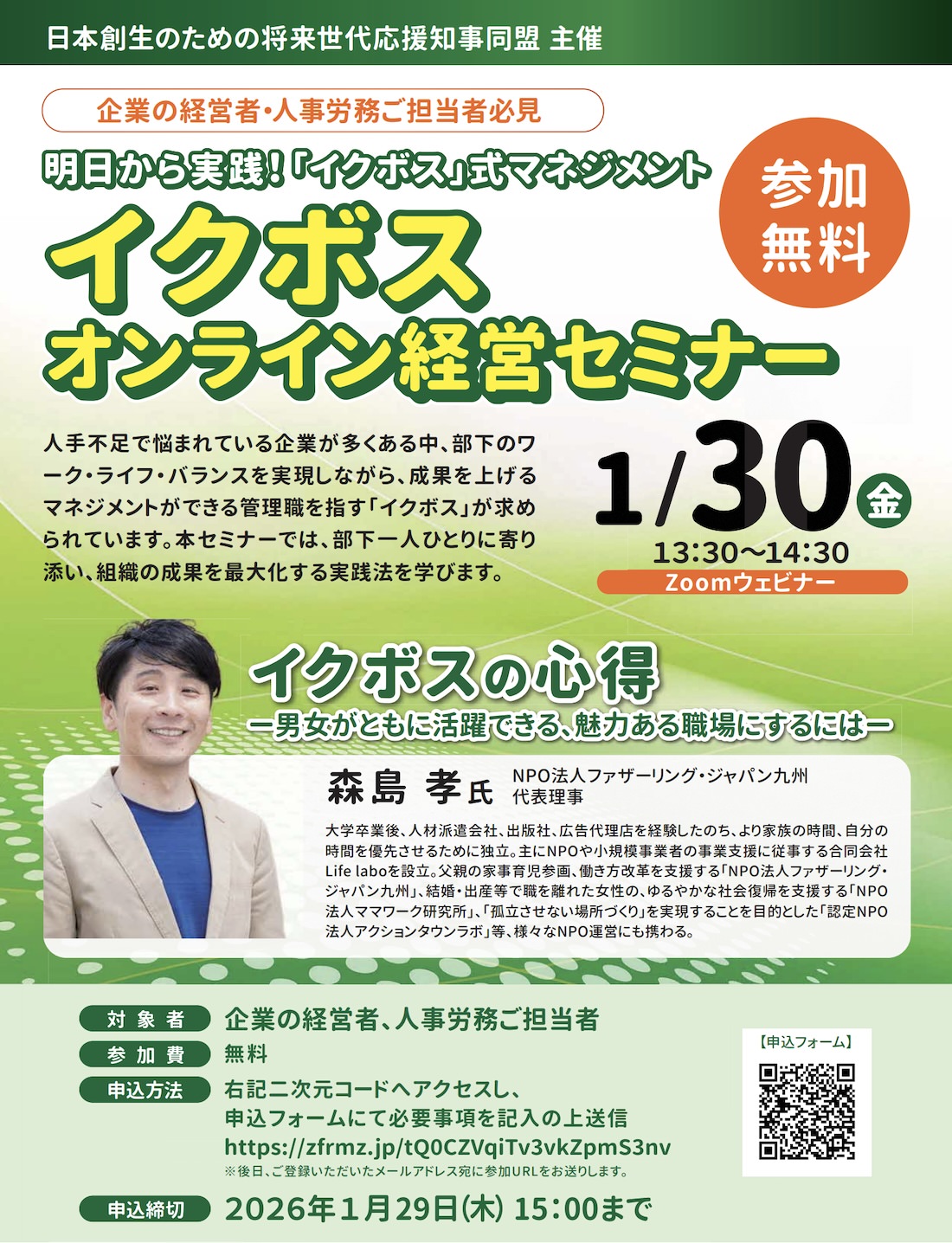 イベント情報 【セミナー登壇】1/30(金)『イクボスオンライン経営セミナー』 kawazoe 2026年1月15日 1月30日(金)、熊本県が加盟する日本創生のための将来世代応援知事同盟主催のイクボスセミナー(オンライン形式)にFJQ代表の森島が講師として登壇します。 開催概要 日時:令和8年(2026年)1月30日(金曜日)13時30分~14時30分 テーマ:イクボスの心得 ー男女がともに活躍できる、魅力ある職場にするにはー 対象者:企業の経営者、人事労務ご担当者 開催方法:Zoomウェビナー 参加費:無料 申込締切:令和8年(2026年)1月29日(木曜日)15時00分 🔗このセミナーのチラシを開く【PDF】