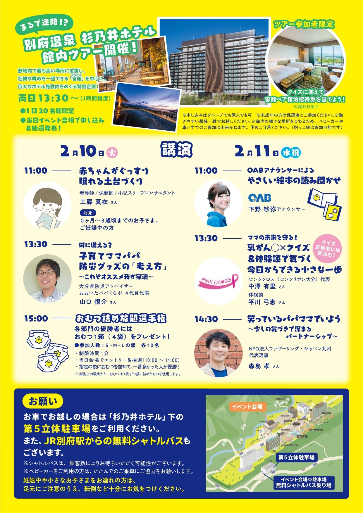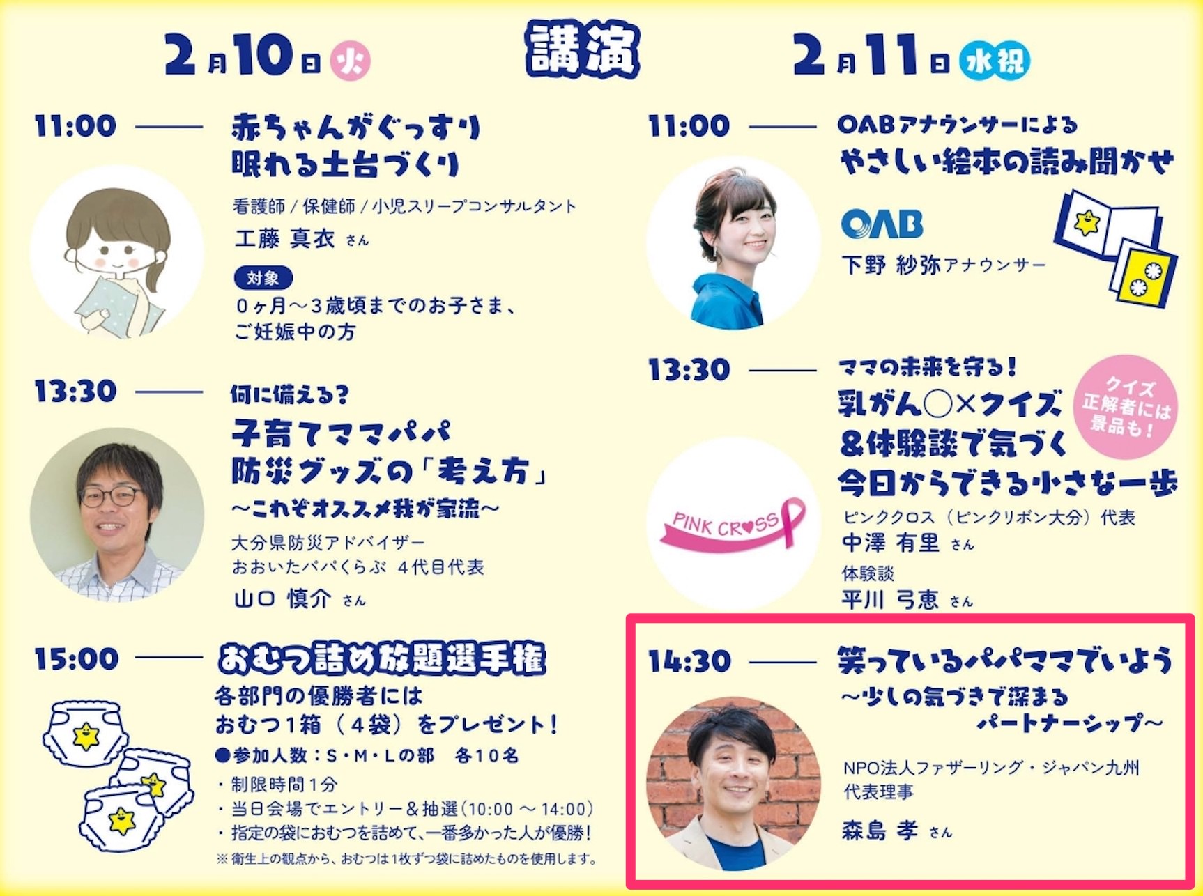 イベント情報 【講演】2/11(水・祝)大分朝日放送主催「子育て応援イベント ぱぱままっと!」(別府温泉 杉乃井ホテル) kawazoe 2026年1月21日 2月10日・11日に開催される大分朝日放送主催「子育て応援イベント ぱぱままっと!」。2日目の11日、FJQ代表の森島が「パートナーシップ」をテーマに講師を務めます。 講演概要 日時:2月11日(水・祝)14:30〜 会 場:別府温泉 杉乃井ホテル 杉乃井ホール [アクセス] 🔗この講演のチラシを見る